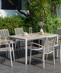 Hình dạng và hình thức gọn gàng của chiếc bàn được bổ sung bởi các chân bàn cách điệu, góp phần tôn lên thiết kế hiện đại của nó. Hình thức chắc chắn và chân đế chắc chắn của bàn đảm bảo rằng nó có thể chịu được các yếu tố thời tiết và tồn tại trong nhiều năm tới. Bàn ăn hình chữ nhật Urbanite có thể kết hợp với tối đa sáu ghế để có thời gian ăn uống thoải mái cho gia đình.