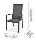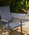 Màu xám kim loại rất linh hoạt và đậm nét, làm cho nó trở thành điểm nhấn đáng chú ý cho bất kỳ khung cảnh ngoài trời nào. Hiệu ứng gỗ được in tinh xảo trên mặt bàn tăng thêm vẻ sang trọng và tinh tế, đồng thời các cạnh sắc nét và gọn gàng mang lại tính thẩm mỹ hiện đại.