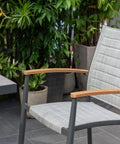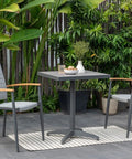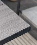 Màu xám kim loại rất linh hoạt và đậm nét, làm cho nó trở thành điểm nhấn đáng chú ý cho bất kỳ khung cảnh ngoài trời nào. Hiệu ứng gỗ được in tinh xảo trên mặt bàn tăng thêm vẻ sang trọng và tinh tế, đồng thời các cạnh sắc nét và gọn gàng mang lại tính thẩm mỹ hiện đại.
