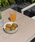 Màu kem rất linh hoạt và đậm nét, làm cho nó trở thành điểm nhấn đáng chú ý cho bất kỳ khung cảnh ngoài trời nào. Hiệu ứng gỗ được in tinh xảo trên mặt bàn tăng thêm vẻ sang trọng và tinh tế, đồng thời các cạnh sắc nét và gọn gàng mang lại tính thẩm mỹ hiện đại.