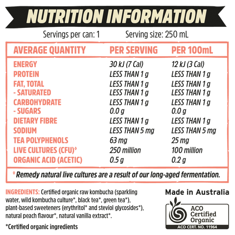 Thành phần: Men Kombucha được chứng nhận organic, nước cốt Đào, chất tạo ngọt thực vật.