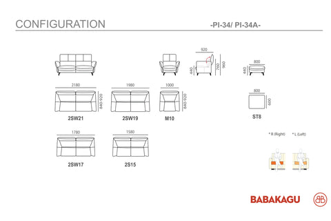 - Sofa 210: W.2180 x D.840/920 x H.440/760/960