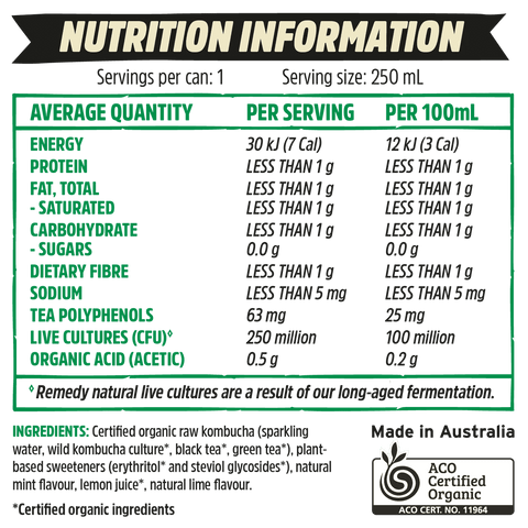 Thành phần: Men Kombucha được chứng nhận organic, nước cốt chanh, chất tạo ngọt thực vật, vị bạc hà tự nhiên.